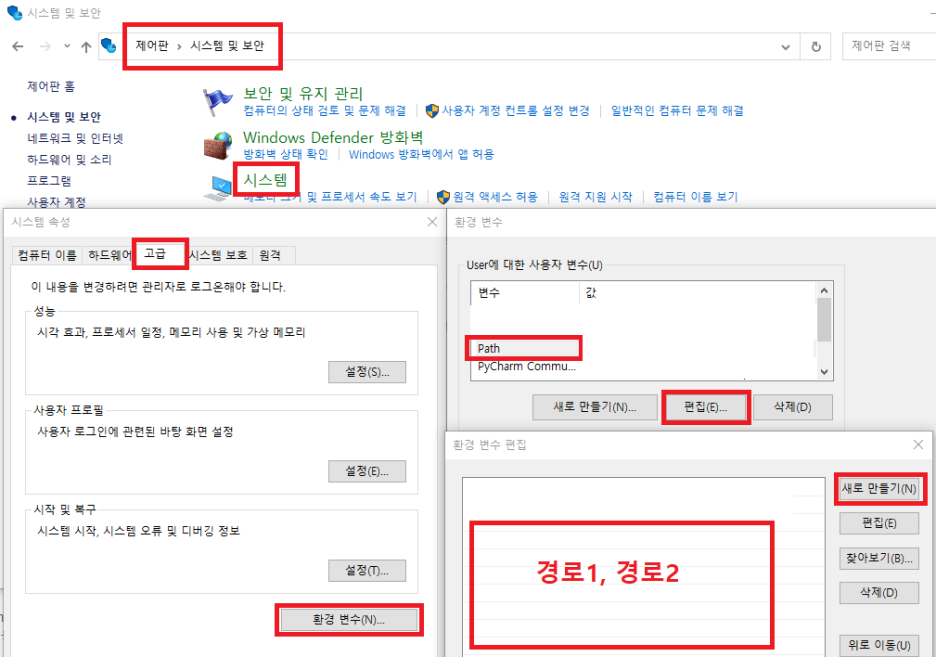 1) 제어판>시스템 및 보안>시스템>고급 시스템 설정>환경변수(N)